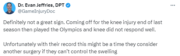 对于恩比德的伤情,医学专家Evan Jeffries表示,这绝对不是一个好兆头。上赛季末膝盖受伤后,他参加了奥运会,但膝盖恢复得并不好。 不幸的是,如果肿胀无法控制,他们可能就得考虑再次手术了。