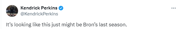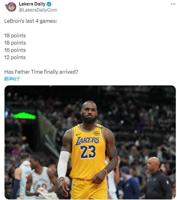 詹姆斯的糟糕表现引热议,湖人媒体晒老詹最近4场的数据,配文写道:时间老人终于到了吗?湖人自媒体晒詹姆斯太老的合成照,名嘴帕金斯更是发推直言:看起来这可能是詹姆斯的最后一个赛季了。