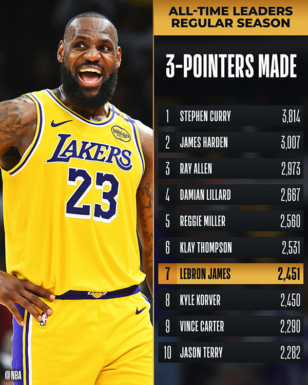 1、詹姆斯生涯三分命中数达到2451记,正式超越科沃尔(2450记三分)升到历史三分榜第七位,独享历史第七