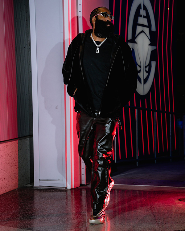 赛前,哈登开着一辆法拉利豪车来到快船20亿新球馆,戴着墨镜和大金链子,穿着皮裤和新款9代战靴入场,双手抄兜相当霸气。