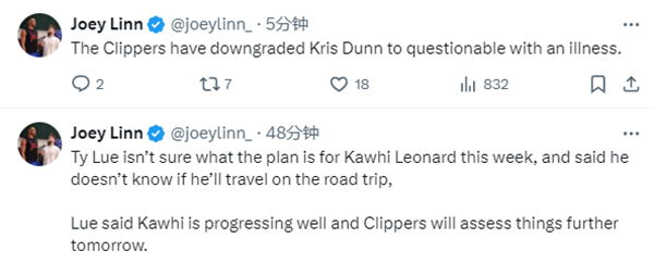 究竟小卡何时能够伤愈复出?赛前泰伦-卢表示不确定莱昂纳德本周的计划是什么,也不知道他是否会随队参加客场之旅;卢帅还表示,莱昂纳德恢复得很好,快船明天会进一步进行评估。