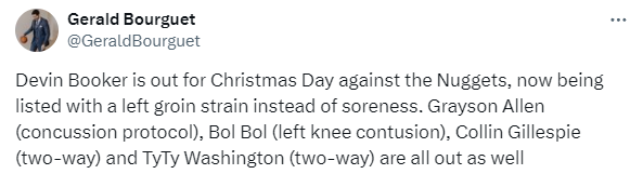来源:24直播网12-25 11:38牛叉NBA录像网讯 北京时间12月25日,太阳官方公布年终大战伤情,布克(腹股沟)、格雷森-阿伦(脑震荡协议)和波尔-波尔(膝盖)都因伤确定缺战掘金;布克继续伤停,杜兰特和比尔再次带队大战掘金,其中比尔深陷交易流言之中。