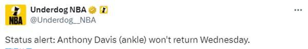 整个第二节,浓眉一直在更衣室中治疗脚踝,之后确定退出比赛;受伤离场前,浓眉首发登场7分12秒,3投0中0分2拉板0助攻0盖帽,正负值-7,希望浓眉的伤势无大碍;本赛季浓眉已经遭遇多种小伤(足底筋膜炎、肩膀刺痛),一直带伤坚持比赛。