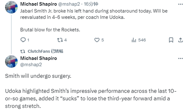 火箭主帅乌度卡证实了小史密斯将接受手术治疗;乌多卡强调了史密斯在过去10多场比赛中的出色表现,并补充说史密斯的受伤令人很难受。