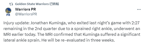 在此前勇士对阵老鹰的比赛中,第二节2分27秒,库明加在补防时落后扭伤右脚踝,痛苦翻滚十分难受,之后一瘸一拐返回更衣室并因右脚踝扭伤退出比赛;赛后库明加拄拐离场。