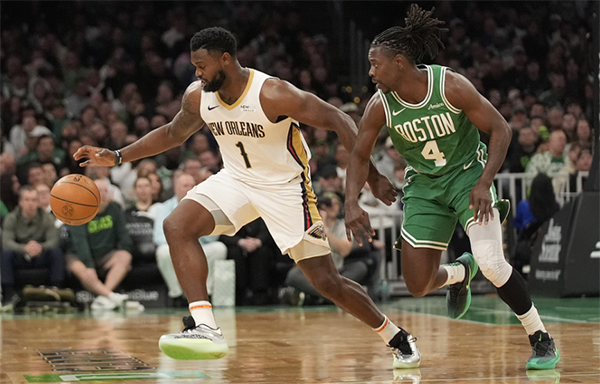 鹈鹕客场挑战卫冕冠军凯尔特人,凭借德章泰-穆雷外线接连命中5记三分以及墨菲的火力输出,鹈鹕第一节35-29领先绿军6分,穆雷首节7中6独砍17分4助攻2篮板,首发出战的锡安第一节没有得分进账。