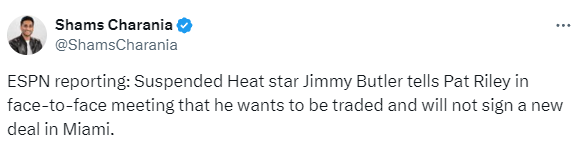 名记shams撰文报道,巴特勒在上周的热火队内会议中和帕特-莱利面对面重申自己想被交易,并且不会和热火续约;巴特勒表示自己最多只会执行下赛季价值5200万美元的球员选项来当做交易的筹码,不会和热火续约。