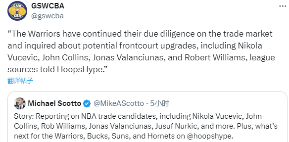 据名记Michael Scotto报道,勇士正寻求前场阵容升级,潜在交易目标有武切维奇、约翰-科林斯、瓦兰丘纳斯、罗伯特-威廉姆斯,某些NBA高管认为,鉴于武切维奇本赛季出色的表现,他的交易价值可能为一个首轮签,多位NBA高管认为,瓦兰丘纳斯和罗威预计将在交易市场上获得多个第二轮选秀权。