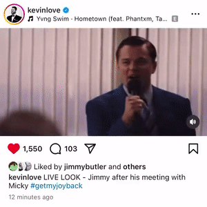 如今巴特勒的7场禁赛已经到期,今日巴特勒与热火老板米奇-阿里森在迈阿密会面,乐福更新Ins晒出华尔街之狼中的男主乔丹·贝尔福特说“我不会离开”的场面,配文写道:现场直播-吉米与米奇会面后#找回我的快乐。