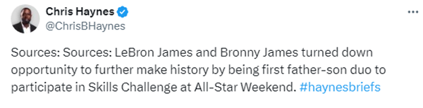 詹姆斯父子拒绝参加全明星技巧赛引热议,快船记者Tomer Azarly发推表示全明星周末已经失去星味了。