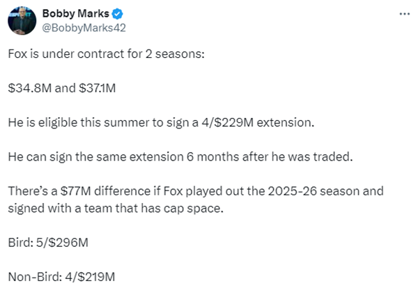 福克斯5年1.63亿美元的合同将在2026年到期,本赛季年薪为3485万美元,2025-26赛季薪资约3710万美元;薪资专家Bobby Marks表示,福克斯在今年夏天有资格签下一份4年2.29亿美元的续约合同,如果他被交易,六个月后也能签下同样的续约合同。