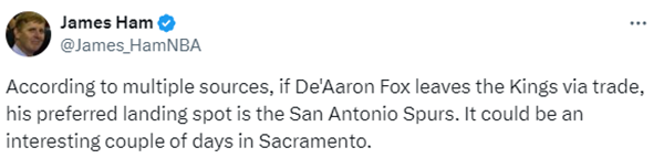 国王随队记者James Ham跟进报道,多个消息来源透露,如果福克斯通过交易离开国王,他的首选下家是圣安东尼奥马刺!