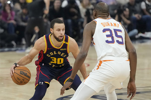 下半场,库里第三节开场连中两记中投,无奈太阳攻势不减,而且库里又失去准星,外线三分继续打铁,勇士落后到20分后库里下场休息,坐在替补席苦笑太无奈;勇士轮换阵容继续反扑,可杜兰特突然挥舞镰刀,三节打完勇士79-98落后19分。