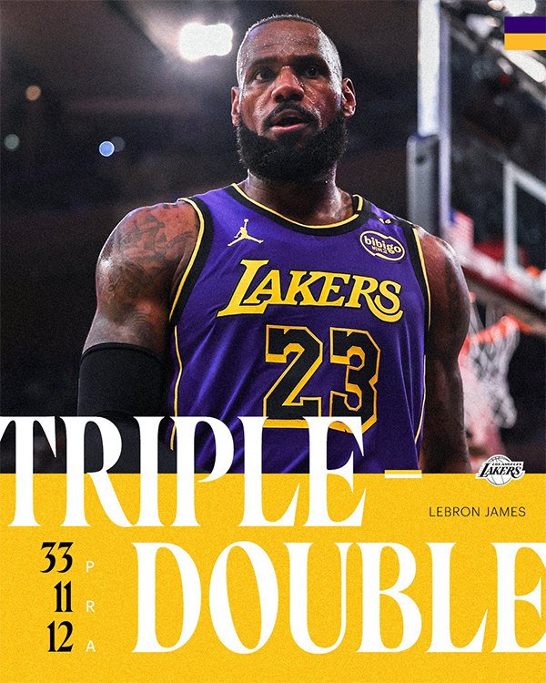 9、詹姆斯成为NBA历史上第一位在40岁及以后年龄多次砍下三双的球员