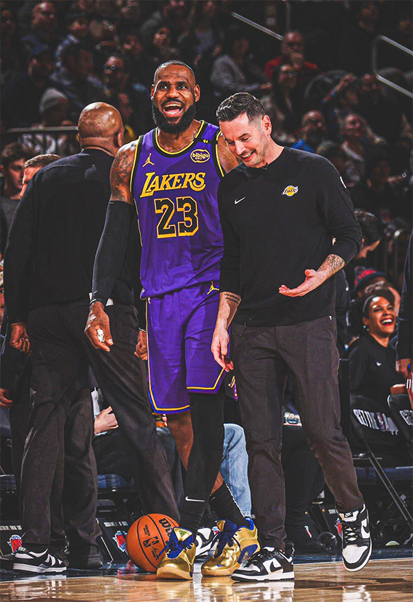 做客麦迪逊广场花园球馆,40岁的詹姆斯早早开启进攻模式,第一节9中6独砍13分,第二节专注于组织进攻,第三节独砍10分,更是轰进金鸡独立式不讲理三分;末节面对尼克斯的反扑,老詹两次暴扣以及轰进三分,带队再次拉开分差,尼克斯提前认输,比赛还剩1分50秒,老詹打卡下班;赛后詹姆斯跑回更衣室,期间冲着镜头做鬼脸。
