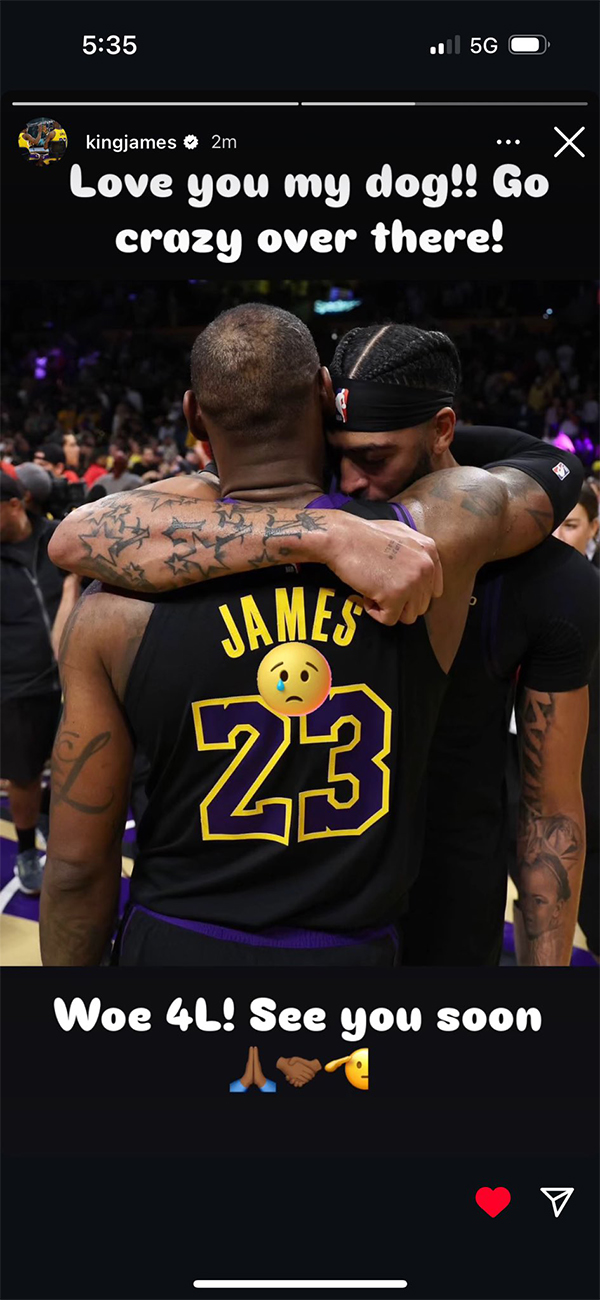 昨天浓眉与东契奇互换的大交易确定之后,有记者称詹姆斯对浓眉越来越不满,对此詹姆斯爆粗回击:你TM就是一个骗子;今日交易官宣后,詹姆斯更新Ins,晒昔日拥抱浓眉的合影,配文写道:爱你我的兄弟!在那里疯狂一把!永远的痛,很快再见!(配上了流泪表情)。