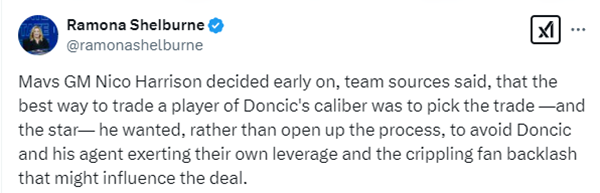 名记Ramona Shelburne报道,独行侠早就决定交易东契奇,暗中操作为避免东契奇及其经纪人影响交易,湖人也没有泄露任何风声;交易达成后,东契奇没有接哈里森的电话,詹姆斯在纽约外出就餐时接到佩林卡的通知电话,欧文在克利夫兰接受治疗时从社媒上得知这笔交易。