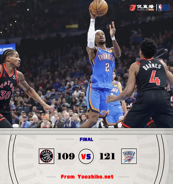 末节,雷霆队状态回暖,开局便展开强势攻势,将领先优势扩大至22分。猛龙队试图反击,分差一度缩小至12分。在比赛的后段,雷霆继续保持稳定的进攻节奏,慢慢拉开比分,最终以121-109战胜猛龙队,取得胜利。