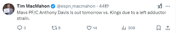 来源:24直播网02-10 12:4524直播网讯 北京时间2月10日,独行侠球星安东尼-戴维斯的伤情出炉,独行侠官方表示,浓眉因左内收肌拉伤将缺席明天与国王的比赛,恐因伤缺席全明星正赛。