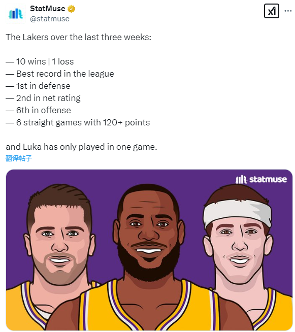 美媒Stat Muse晒出湖人最近三周10胜1负的表现——最近11场拿到10场胜利,同期战绩联盟最佳(雷霆和灰熊是9胜2负);防守效率高居联盟第一(控制对手得分106.2分),净效率联盟第二(场均赢15.1分仅次于雷霆的16.2分);进攻效率联盟第六,连续6场至少拿到120分,东契奇才只打了一场比赛。