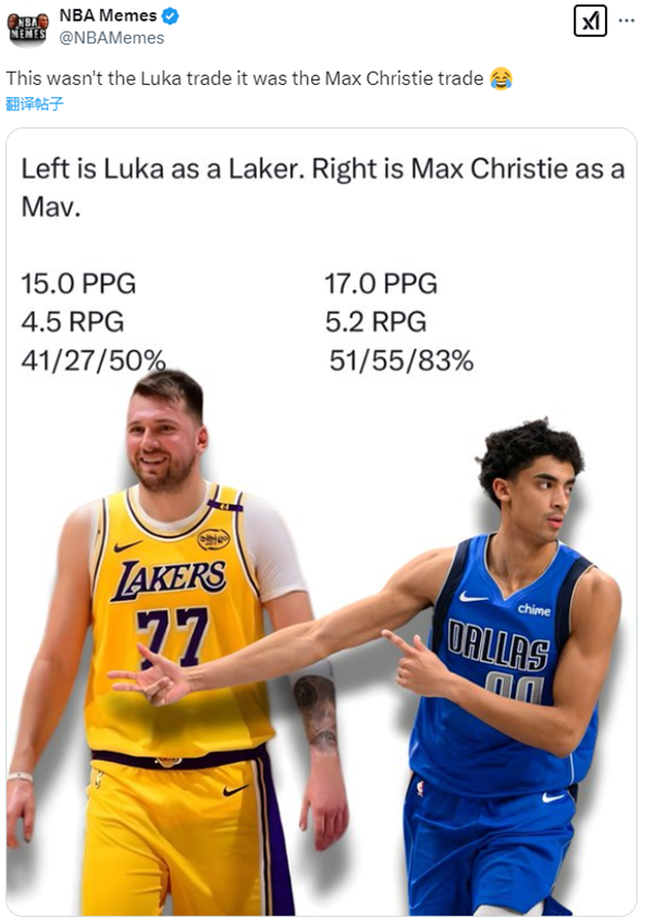 美媒晒出克里斯蒂和东契奇两人的数据,东契奇为湖人出战2场比赛,场均拿到15分4.5篮板,三项命中率为41/27/50%,美媒调侃东契奇不是交易主体,克里斯蒂才是交易主体;还有美媒表示独行侠赢得了这笔大交易。