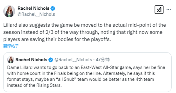 利拉德给全明星赛提了一些建议,主要有4点——1、回到东部VS西部模式;2、冠军将拥有总决赛主场优势;3、如果还是这个赛制,那由“落选球星”组成第4队,替换新秀队;4、赛程安排在赛季中而不是接近季后赛的阶段。