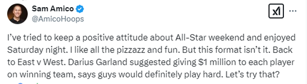 名记Sam Amico发推写道:我试图对全明星周末保持积极的态度,并享受晚上的比赛。我喜欢所有的活力和乐趣。但这种赛制不幸,回到东西部对决。加兰建议给获胜球队的每位球员100万美元,并表示球员们一定会努力比赛。让我们试试看吧。