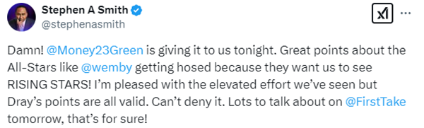 名嘴A-史密斯发推称追梦的观点很好,比如文班亚马被坑了,因为他想让我们看到新星,很高兴他付出了巨大的努力;追梦的观点是正确的,不可否认。