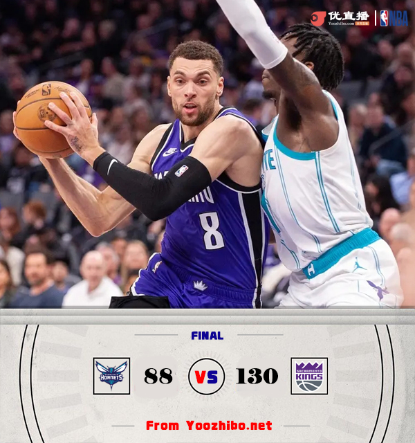 末节,国王队状态显著提升,依靠一波强劲的进攻将优势扩展至45分。随着比赛进入小节后段,黄蜂队虽然持续紧追,但仍然无法缩小分差。进入本节末段时,国王的优势依旧明显。国王的拉文在这一节中表现出色,独得18分,其中包括4记三分球。最终,国王以130-88赢得了比赛。