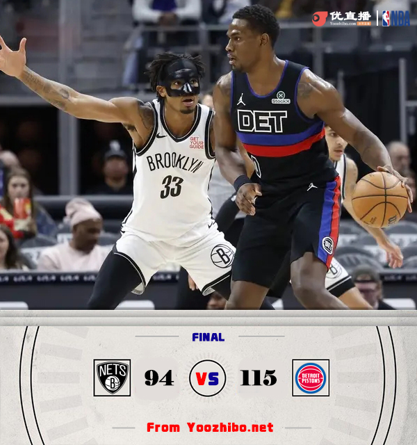 NBA常规赛,活塞今日迎战篮网,前者上场比赛输给掘金,后者则是遭遇三连败,此役拉塞尔、小托马斯、克洛尼和艾维等人缺战。比赛上来,场上就呈现出一边倒的局势,篮网在半节的时间里只拿到4分,而活塞这边杜伦统治了攻防,在他的带领下球队也是打出19-4的完美开局,比斯利上场后连中三分,活塞单节轰下39分,次节活塞依旧占据着场上的主动权,分差也是突破了二十分,半场结束时篮网落后23分;下半场回来,活塞的进攻出现大问题,单节只拿到13分,尤其是三节节末连续出现失误被篮网追到个位数,末节活塞重整旗鼓,双方也是火药味十足,比斯利挑衅观众被驱逐,不过分差一直在十分以上,最终活塞轻取篮网,送给后者四连败。