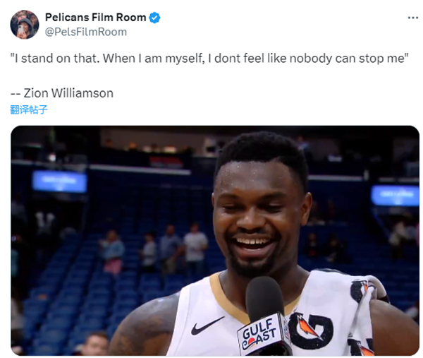 赛后接受采访时,锡安表示:我就是这么看的,当我做自己的时候,没人能阻挡我。