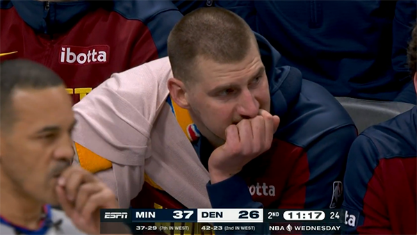 第一节,掘金4-14开场早早落后10分,约基奇扛起球队的进攻大旗,无奈森林狼的火力太猛,即使约基奇首节打满12分钟,11中7独砍15分4篮板2助攻,掘金第一节仍26-34落后8分。