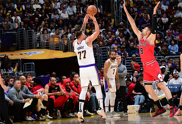 上一场湖人主场背靠背惨败雄鹿,东契奇、詹姆斯、里夫斯等7人休战,今日主场迎战公牛,东契奇重返赛场,开场和詹姆斯一起组织进攻,打着打着东契奇在进攻端发力,欧洲步突破抛投命中,外线接连轰进3记三分,首节8投5中独砍17分5篮板2助攻,对飚单节8中6轰下16分的科比-怀特。