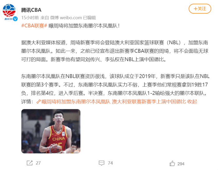 来源:24直播网09-07 10:2024直播网9月07日讯,重磅新闻,美国名记Marc Stein报道,消息人士透露,周琦确定将加盟NBL墨尔本凤凰队。