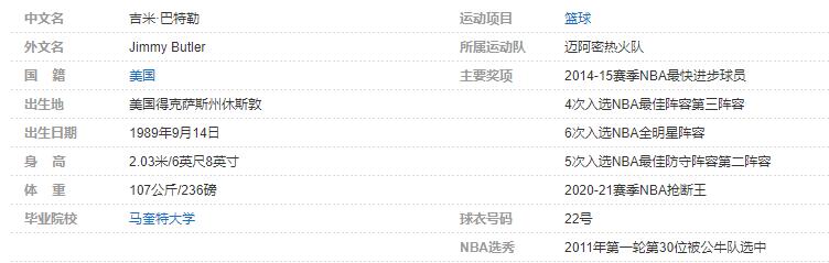 吉米·巴特勒于2011年通过选秀进入NBA,先后效力于公牛、森林狼、76人以及热火队,2014-15赛季荣膺进步最快球员,2020-21赛季当选NBA抢断王,6次入选NBA全明星阵容,4次入选NBA最佳阵容第三阵容,5次入选NBA最佳防守阵容第二阵容。