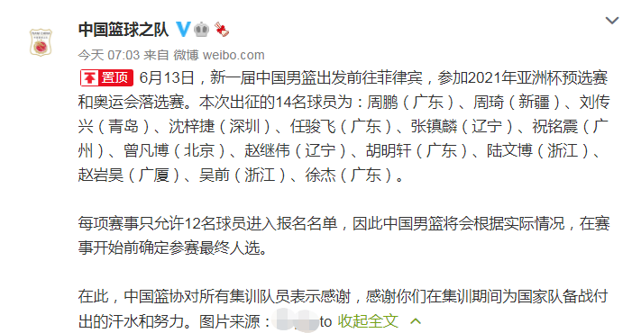 目前,官方也已经公布国家队14人阵容:周鹏,周琦,刘传兴,沈梓捷,任骏飞,张镇麟,祝铭震,曾凡博,赵继伟,胡明轩,陆文博,赵岩昊,吴前,徐杰。