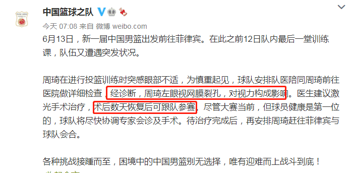 而就在今天早上,据官方消息,周琦受伤,遭遇视网膜裂孔的伤病,需要接受手术。据悉,周琦是在投篮训练中感到眼部不舒服,随后队医对他进行了检查,最终确诊为视网膜裂孔(视网膜一处全层裂开,就像衣服上有破口一样),医生建议进行手术。球队会尽快协调专家会诊和手术。好消息是,周琦在手术完成后,会前往菲律宾和国家队会合,据悉,周琦术后数天后可以跟队参赛。