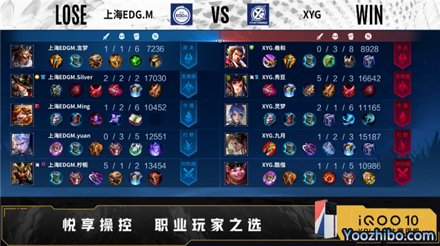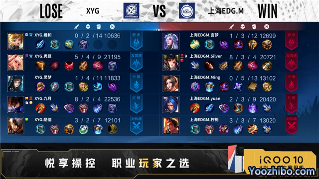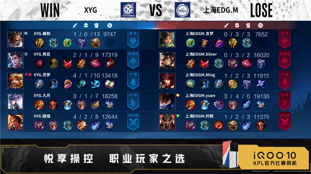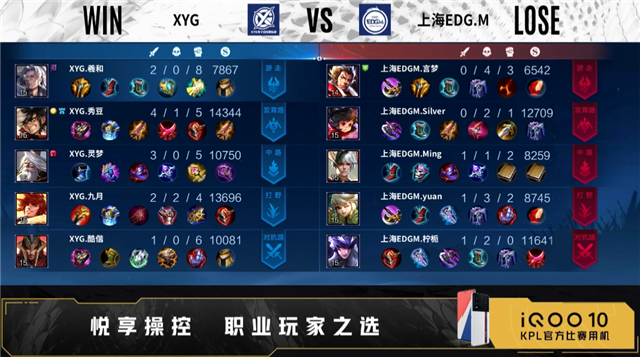 开局双方正常抢线。50秒中路野区XYG击杀明世隐,拿下一血。2分22秒对抗路上海EDG.M击杀夏侯惇,打出0换1。5分41秒XYG拿下暴君,上海EDG.M摧毁敌方对抗路外塔,中路XYG击杀吕布,打出0换2。6分28秒上海EDG.M摧毁敌方发育路外塔。7分32秒中路上海EDG.M击杀西施,XYG反杀孙尚香、明世隐,打出0换2,摧毁敌方中路外塔、二塔,拿下主宰。9分05秒XYG摧毁敌方发育路外塔。10分17秒XYG摧毁敌方对抗路外塔,野区XYG澜三连决胜,打出1换4,拿下暗影暴君。11分55秒XYG摧毁敌方对抗路二塔,上海EDG.M摧毁敌方发育路二塔。12分59秒对抗路XYG击杀橘右京,拿下暗影主宰。14分01秒XYG摧毁敌方发育路二塔、对抗路高地。15分33秒XYG拿下暗影暴君。16分24秒发育路上海EDG.M击杀西施,双方法师互换。18分42秒河道XYG击杀吕布,上海EDG.M孙尚香二连击破,打出2换3,拿下暗影主宰。20分54秒野区XYG击杀不知火舞,打出1换2,上海EDG.M摧毁敌方发育路高地。22分30秒XYG关键抢夺风暴龙王,双方打野互换。23分50秒XYG摧毁敌方发育路高地。26分56秒河道上海EDG.M击杀西施,孙尚香二连击破,打出1换4,摧毁敌方中路二塔、中路高地,击杀孙膑,团灭对手摧毁水晶拿下比赛。