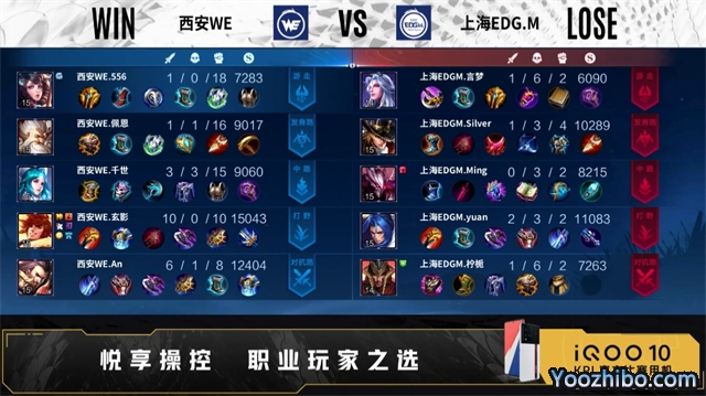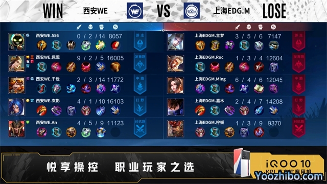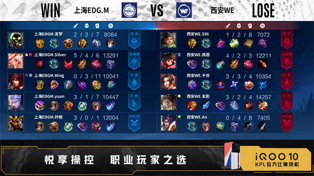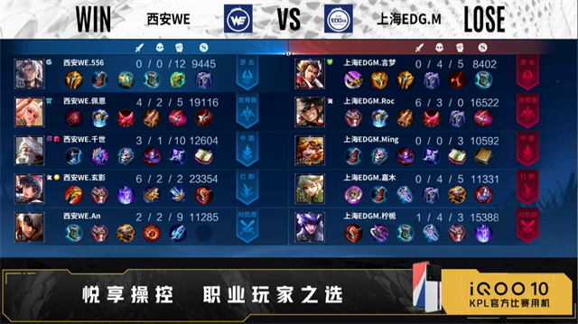 开局双方正常抢线。50秒野区上海EDG.M击杀曹操,拿下一血。2分19秒上海EDG.M拿下暴君,野区团战西安WE击杀明世隐,打出0换3。3分41秒发育路西安WE击杀马可波罗,打出0换1,上海EDG.M拿下主宰。4分34秒对抗路西安WE击杀明世隐,曹操二连击破,打出1换2。5分23秒野区西安WE击杀明世隐,摧毁敌方对抗路外塔、发育路外塔。6分32秒西安WE拿下暴君。7分28秒中路西安WE击杀干将莫邪,打出0换2,摧毁敌方中路外塔,击杀橘右京,上海EDG.M摧毁敌方中路外塔。8分36秒西安WE拿下主宰,野区上海EDG.M橘右京二连击破,西安WE摧毁敌方中路二塔。10分20秒上海EDG.M拿下暗影主宰,西安WE拿下暗影暴君,击杀明世隐,摧毁敌方对抗路二塔,上海EDG.M摧毁敌方发育路外塔。11分50秒野区西安WE击杀马可波罗,裴擒虎三连决胜,打出0换4,摧毁敌方对抗路高地。14分23秒西安WE拿下暗影暴君。15分14秒高地西安WE击杀蒙恬,摧毁敌方发育路高地、中路高地,裴擒虎四连超凡,团灭对手摧毁水晶拿下比赛。