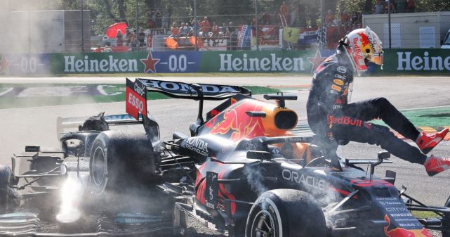 第26圈,汉密尔顿进站,换上一套中性胎,他的换胎也出现了小失误。出站之后汉密尔顿便与维斯塔潘展开了轮对轮的较量,最终两辆赛车在1号弯发生了碰撞,两人双双退赛,赛会出动了安全车。一众车手借机进站完成了换胎。