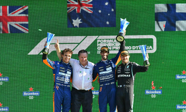 24直播网讯 北京时间09月12日晚,2021F1意大利大奖赛正赛在蒙扎赛道结束。迈凯伦车队包揽冠亚军,里卡多夺冠并创造了单圈最速,诺里斯亚军,这也是迈凯伦车队2010年加拿大站之后再次包揽冠亚军;梅赛德斯车队博塔斯从队尾发车最终超至第三名。法拉利车队勒克莱尔第四,加罚5秒的红牛车队佩雷兹第五,塞恩斯第六,斯托尔、阿隆索、拉塞尔、奥康分列七至十位。