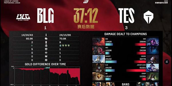 第一局,BLG在第一波巢虫团拿下主动权之后TES没有太多办法扭转战局,18分钟BLG抓住正面多个人的timing强开击杀369安蓓萨,随后用先锋强撞中一塔之后再拉扯打出1换4!Elk伊泽瑞尔这波三杀收割之后BLG拿下了5K的经济优势!小龙团Crisp芮尔强开效果不错,但是全部处理Elk的TES众人管不住knight阿萝拉+Bin兰博,这波BLG打出3换5团灭TES之后顺势再拿厄塔汗+大龙。带着大龙BUFF一波推平TES基地!BLG拿下第一分!本局MVP为knight!