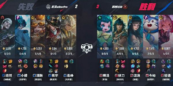 第三局,武汉eStarPro开场便展现强势。1分钟时,三人包下,武汉eStar亮宇操控狄仁杰成功击杀司空震,拿下一血。3分钟,亮宇的狄仁杰持续输出,磨掉下路一塔。4分钟,苏州KSG虽拿到第一条小暴君,可武汉eStarPro凭借完美COMBO链击杀大司命,顺势推掉下路二塔。中期双方频繁交锋,人头交替入账,武汉eStarPro率先推掉中路一塔。10分钟,苏州KSG压低对方血线,控下暗影暴君并反推中路一塔。但12分20秒,武汉eStarPro开启奔狼,eStarPro坦然的狂铁果断闪现切死鲁班七号,乘胜追击团灭对手。13分钟,武汉eStarPro推掉水晶,率先来到赛点局。本局MVP为eStarPro坦然 (孙麟威)狂铁!