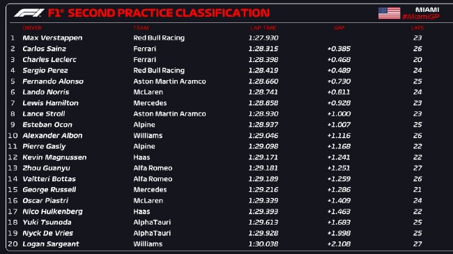 24直播网讯 2023年F1迈阿密大奖赛第2次练习赛结束,红牛车队维斯塔潘以1:27.930排名第一,法拉利车队塞恩斯落后0.385秒排名第二,他的队友勒克莱尔落后0.468秒排名第三。佩雷兹和阿隆索分列四五,排名六至十位的车手分别是诺里斯、汉密尔顿、斯托尔、奥康、阿尔本。