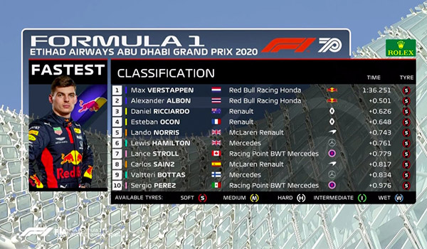 24直播网讯:北京时间12月12日晚,结束了F1阿布扎比大奖赛第三次练习赛,维斯塔潘做出1:36.251的最快单圈,排名第一,队友阿尔本第二,慢了半秒。雷诺车队的两位车手里卡多和奥康紧随其后,诺里斯第五,汉密尔顿第六;斯托尔、塞恩斯、博塔斯、佩雷兹分列七至十位。