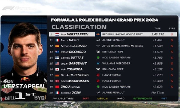 Q3:维斯塔潘在第一轮飞驰圈中刷出全场最快,领先优势达0.606秒。两台迈凯伦和两台梅赛德斯在第一轮飞驰圈后没有选择进站,连续做了第二轮飞驰圈,诺里斯提升了自己的名次来到第4位。最终维斯塔潘以1分53秒159取得比利时大奖赛排位赛第一,但因受罚,正赛发车位将是第11位。勒克莱尔落后维斯塔潘的最快圈速0.595秒,取得排位赛第二名,在维斯塔潘罚退后,他将在周日正赛中从杆位发车。
