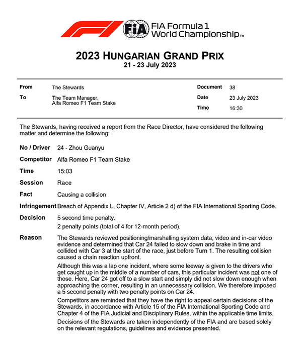 比赛结束之后,最终排名第16的周冠宇巨大遗憾,除了排名巨幅下滑之外,他还收到了国际汽联的罚单,原因是周冠宇在发车圈1号弯导致碰撞事故,赛中已经加罚5秒,同时超级驾照被扣2分。如果周冠宇在12个月之内累积了12个或更多的扣分,将会被禁赛一场。