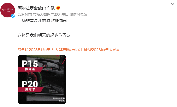 同时周冠宇还直言:“排位赛进行的不顺利,细节不到位,比赛很奇怪,车队也暂时没有和自己说明,赛车也缺乏抓地力,滑得很厉害。我们还在研究到底发生了什么,但我们一定会调查清楚并妥善解决。不过我们已经没有什么可失去的了,希望能在正赛日之前解决问题,向更靠前的位置进发。”
