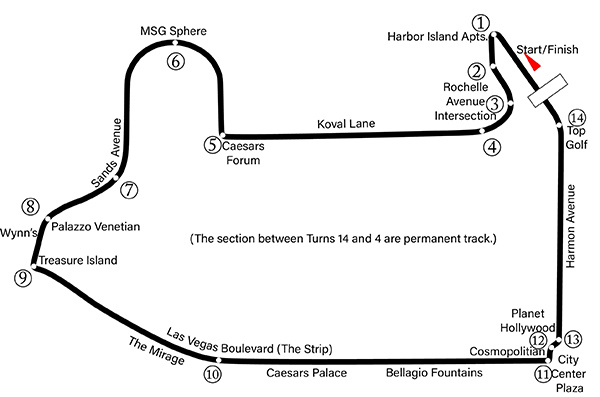 F1拉斯维加斯街道赛道为一个超快速短期性街道赛道,车手会经过数个地标性建筑,包括赌场和酒店作美丽背景。拉斯维加斯市也已授予F1在10年内使用之比赛所需道路的法律许可。