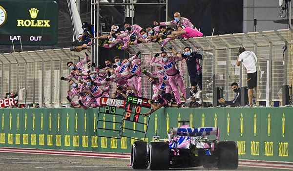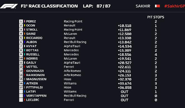 24直播网讯:北京时间12月07日,2020赛季F1锦标赛继续在巴林举行连续第二周的争夺,为了跟上一周的比赛区分,本周末的比赛也被赛会冠名为“萨基尔大奖赛”,经过87圈的激烈争夺,赛点车队的墨西哥车手佩雷兹摘得职业生涯首个分站冠军,雷诺车队的奥康获得亚军,职业生涯首次登上领奖台,赛点车队的斯托尔位列季军,梅赛德斯车队则由于在比赛后半段出现换错轮胎的重大失误,两位车手博塔斯和拉塞尔仅仅位列第8和第9位。